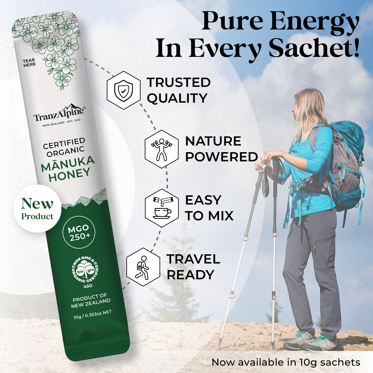 Now available in convenient 10g liquid sachets, our MGO250+ Organic Manuka Honey delivers everyday wellness in a format that’s perfect for on-the-go lifestyles. Whether you are mixing into warm drinks, drizzling over breakfast, or fueling your next adventure—each sachet is nature powered, easy to mix and travel-ready.